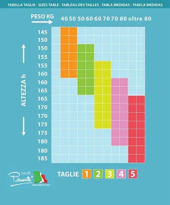 Le taglie 1-2-3 con tassello cotone, la taglia 4 calibrata con metà tassello dorsale, la taglia 5 supercalibrata con tassello dorsale intero.